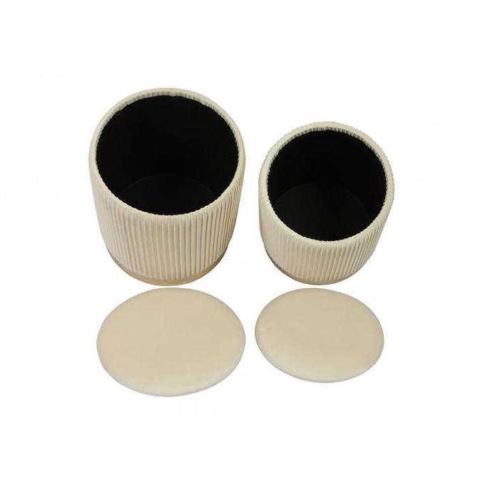 Perfect for small spaces this pleated round ottoman offers both, stunning design and ample storage space. Available in two neutral colors, it's upholstered in soft velvet and complemented with a brushed gold base. Set includes two ottomans.