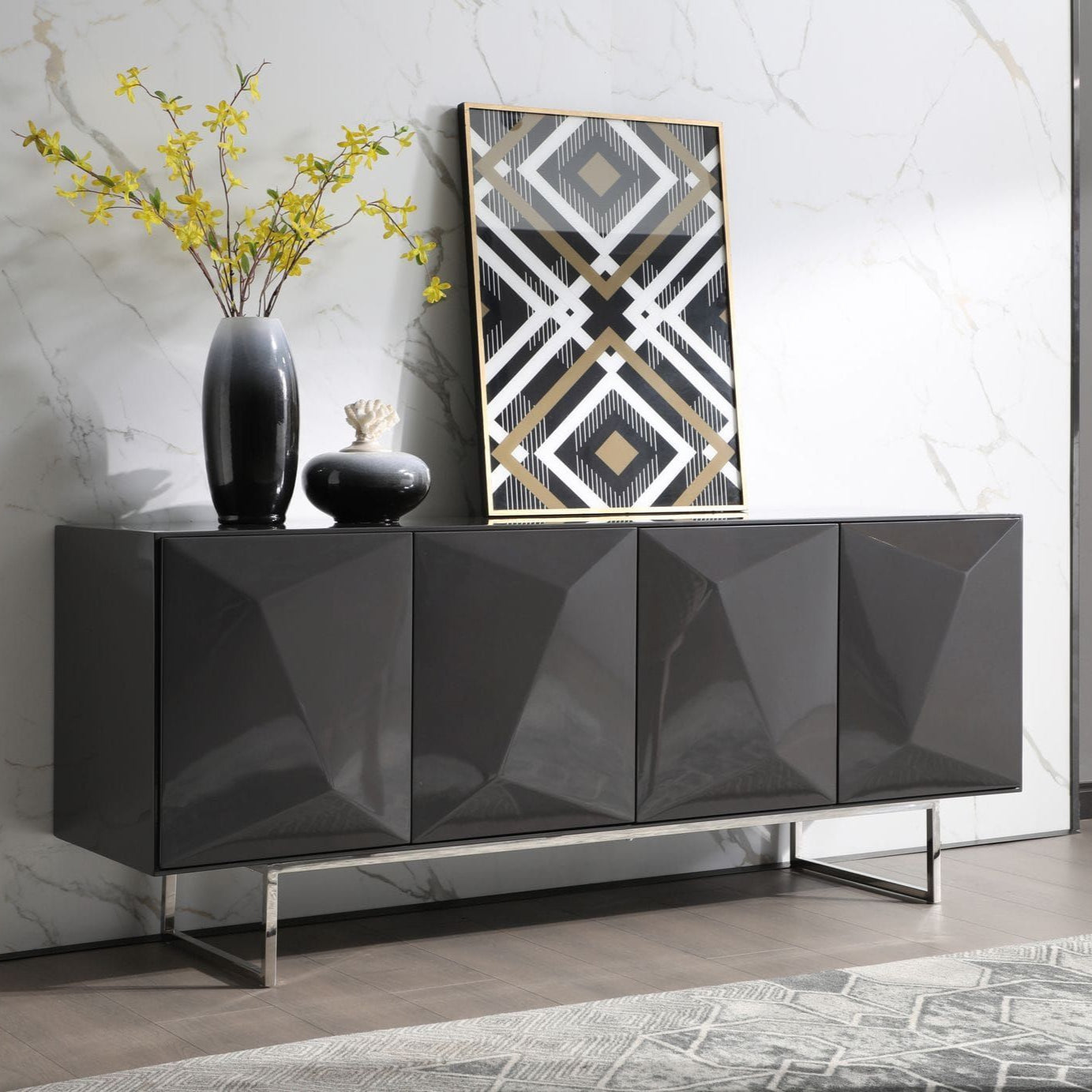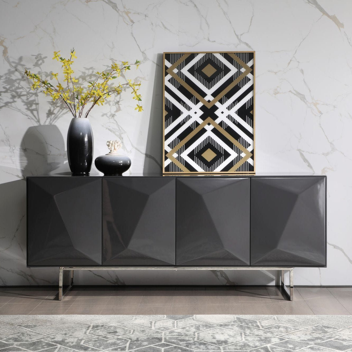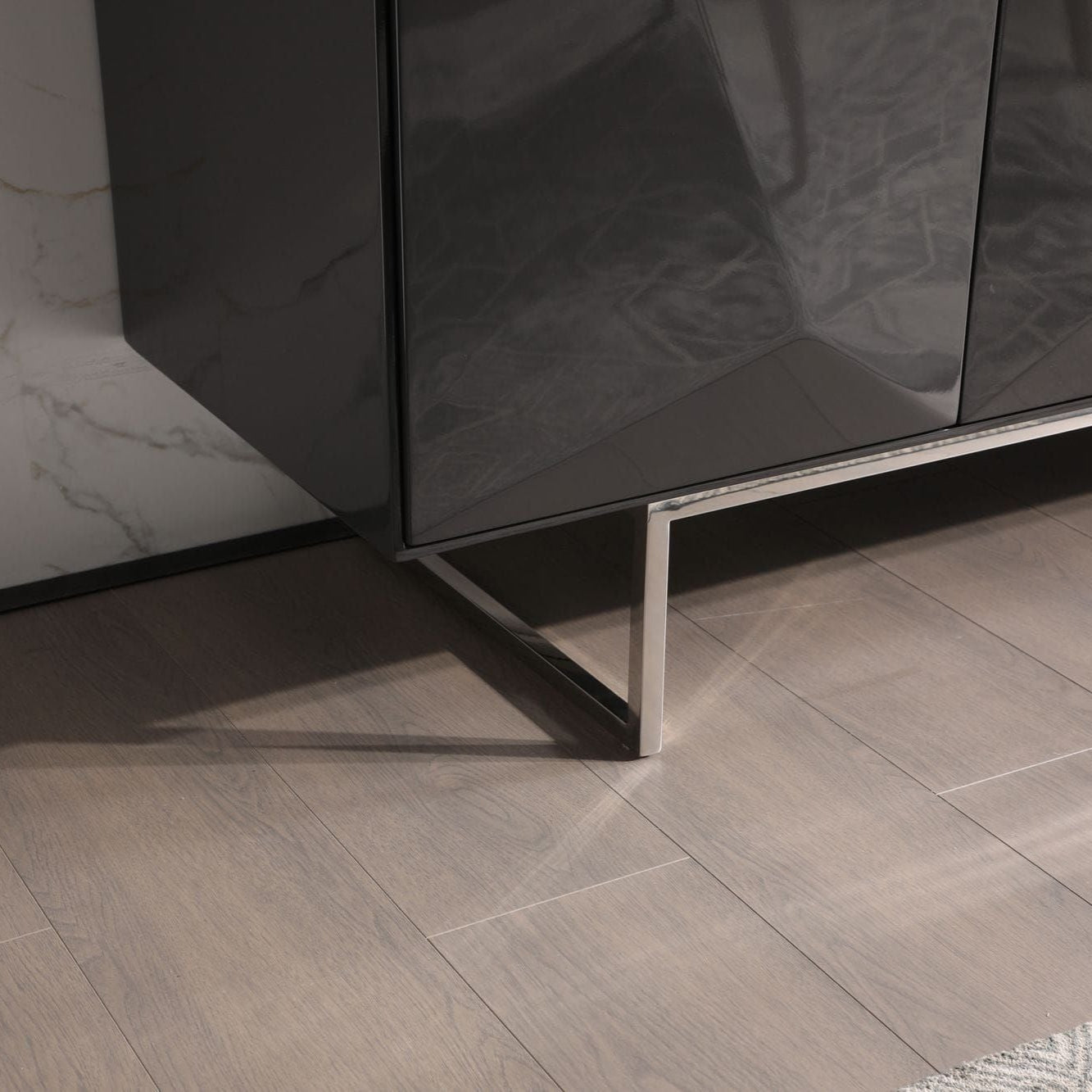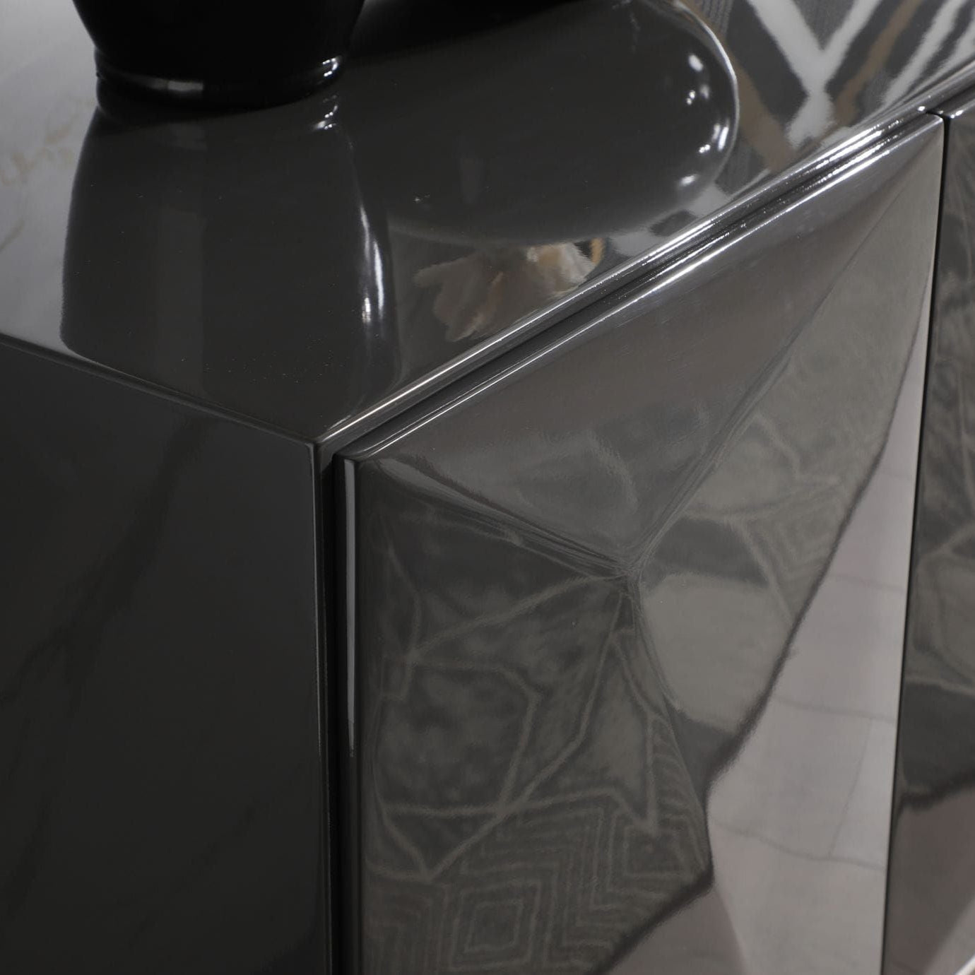 The Vanguard Buffet is an eye-catching piece of dining furniture. The dark grey high gloss finish is unique and the architectural facing of the doors adds class to a space. The buffet also features two shelved cabinets and two drawer cabinets, all with soft closing doors.