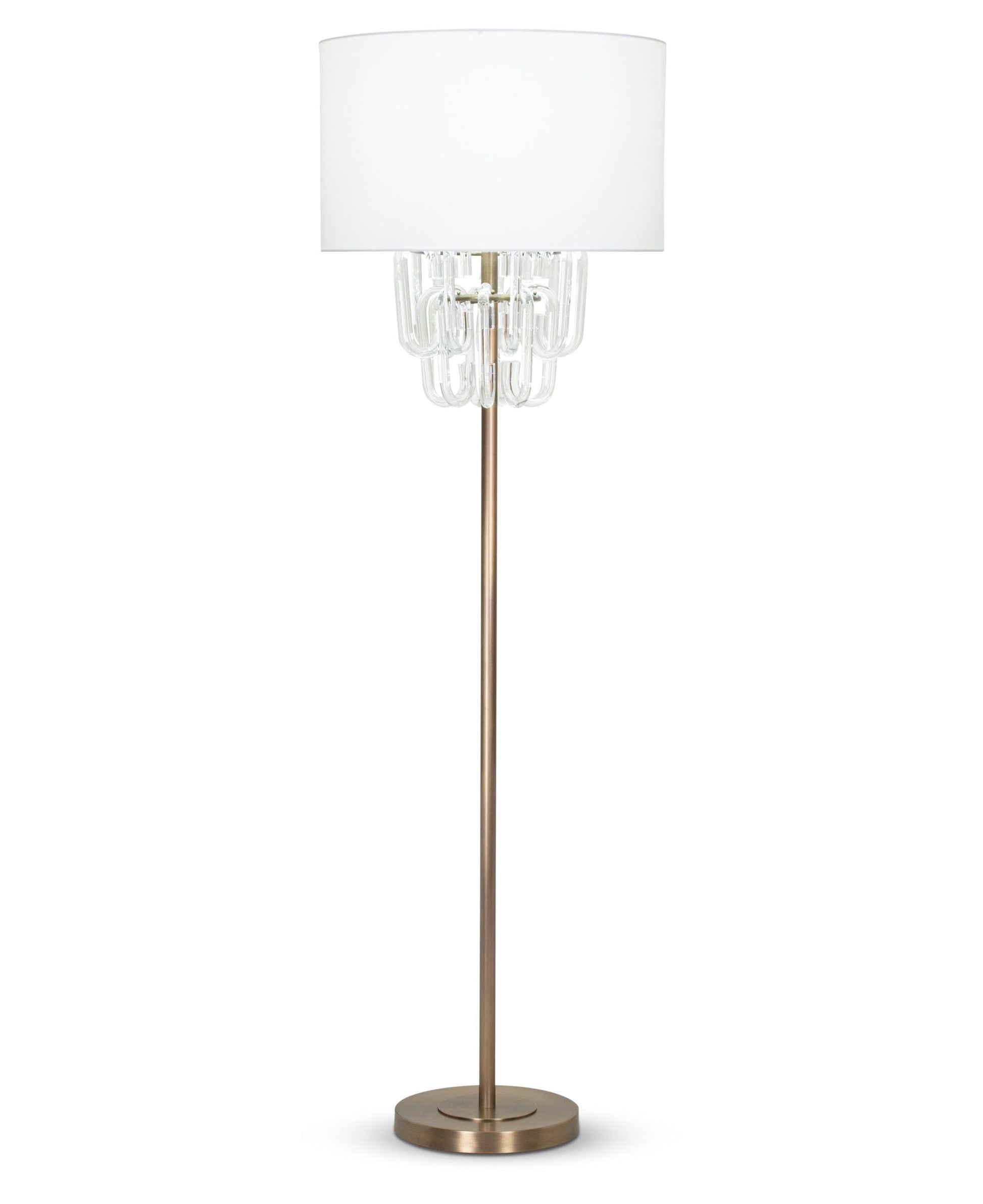 Individual curved glass pieces are positioned in a dimensional pattern right underneath the shade of this floor lamp and under the light, they really sparkle. An Antique Brass stem and base provide the perfect foil.