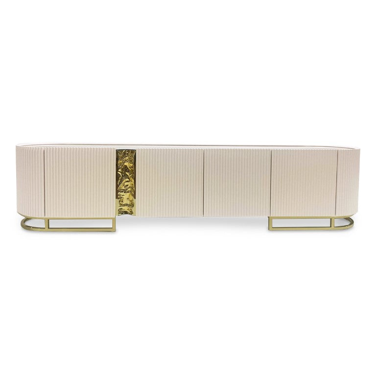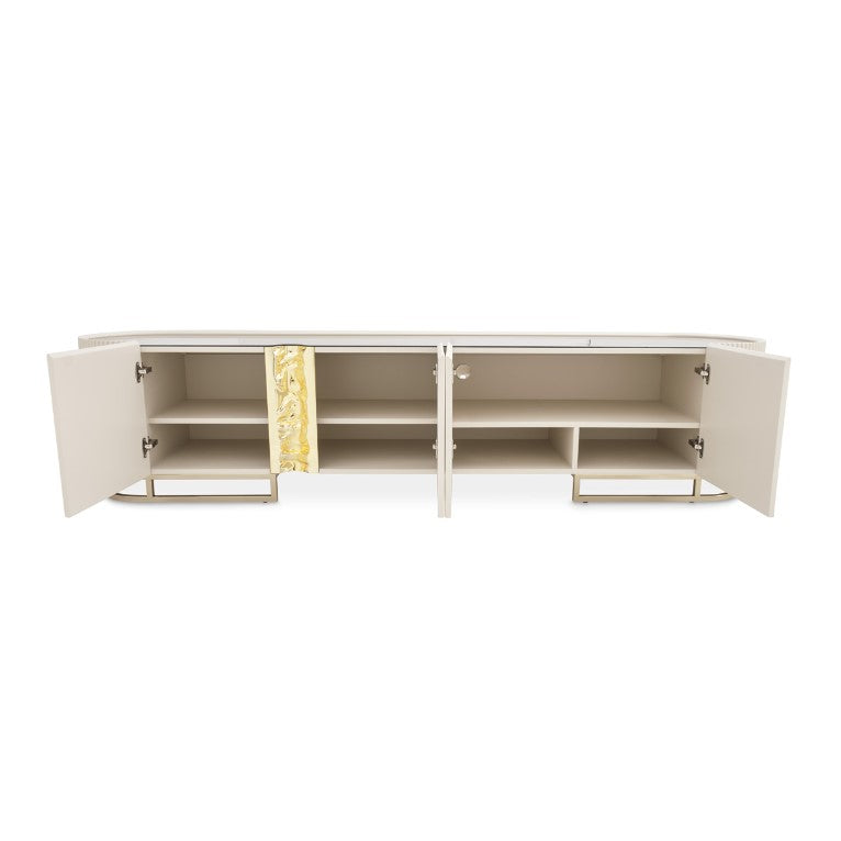 TV Stand in White High Gloss Lacquer body and Walnut accent with soft closing drawer doors (inside is White Matte).