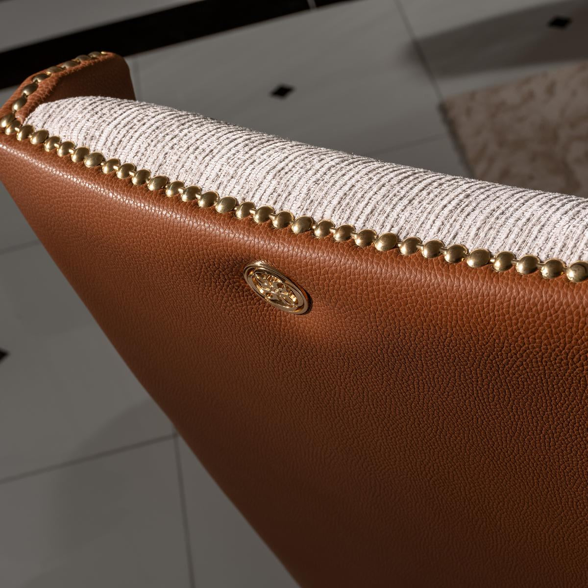 The Nevada Dining Chair is a masterclass in refined luxury and meticulous craftsmanship. Upholstered in a rich cognac-toned leather paired with a textured ivory fabric, this chair embodies sophistication and comfort. The plush backrest features a decorative row of antique gold studs, adding a touch of timeless elegance. Perfectly suited for elevated dining experiences, the Nevada Chair complements both classic and contemporary interiors with effortless grace.