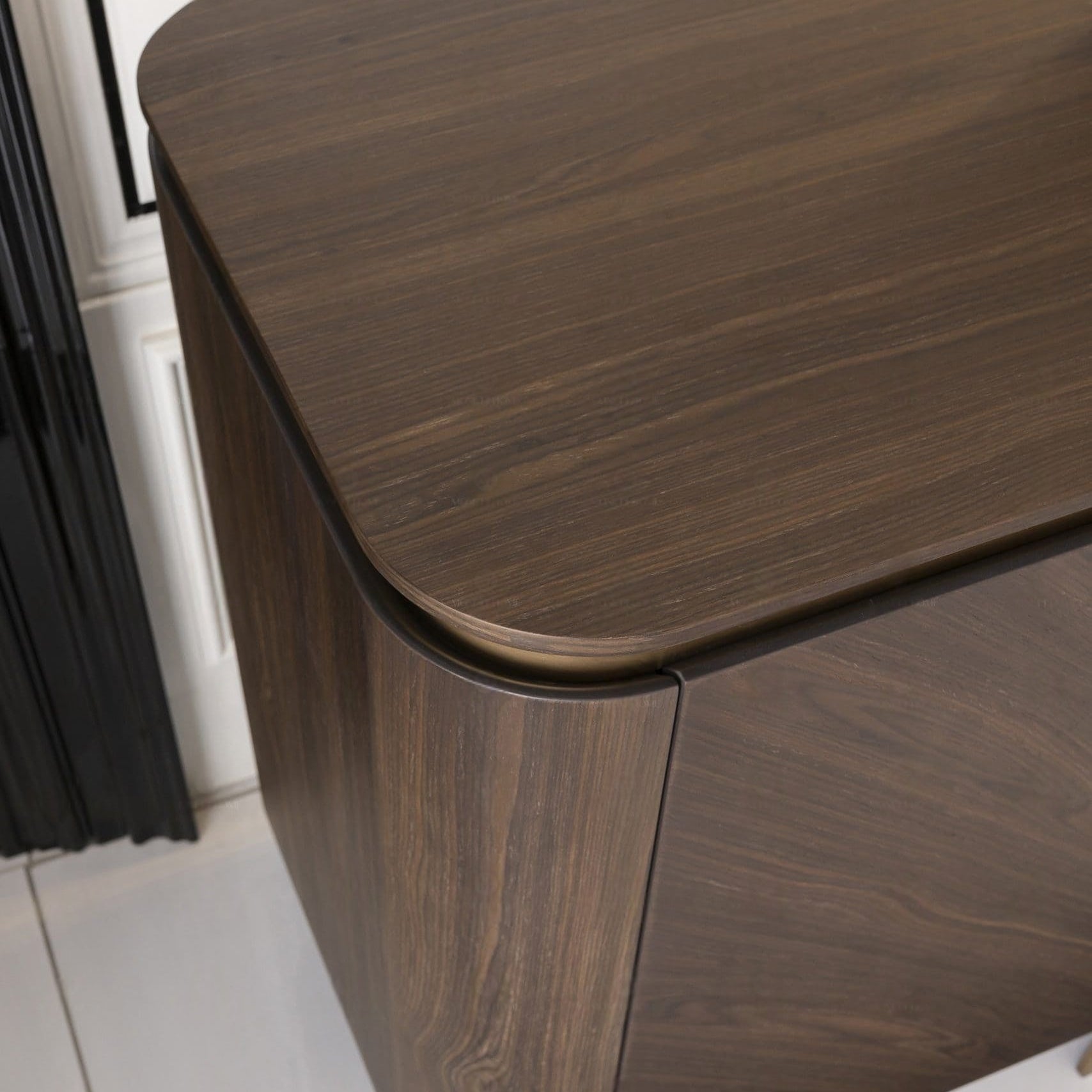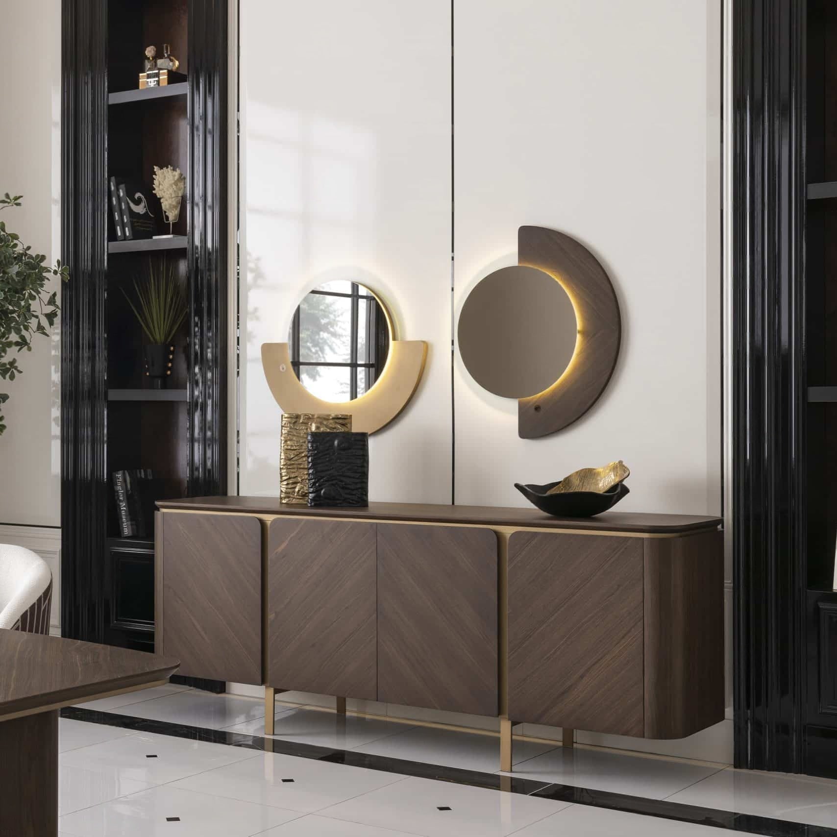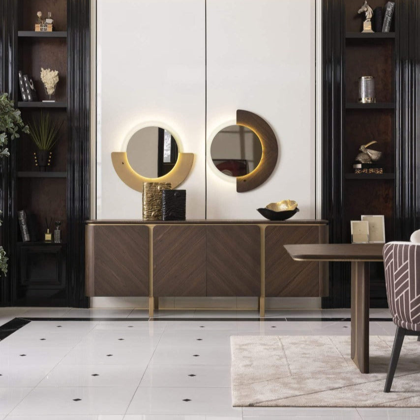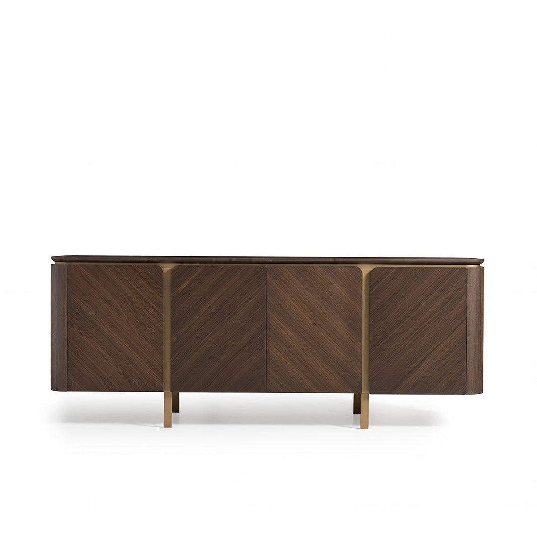Crafted with exquisite attention to detail, the Terra Console showcases the beauty of solid walnut, with a captivating diagonal grain pattern across its four doors. The console's sleek, rounded edges are perfectly complemented by its minimalist yet sturdy metallic base, finished in a subtle brass tone, adding a touch of understated luxury.