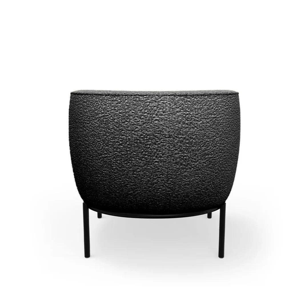 The Finn lounge chair is wrapped in a soft textured boucle fabric. This piece features a beautiful rounded silhouette with a minimal black powder coated frame. Also available in a black licorice option.