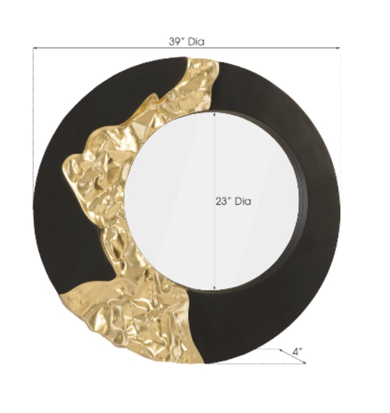Dramatic in size and finished in black with gold leaf accents with a 23' diameter mirror. Textured finish gives the sense of a crushed design. The perfect piece to be used as both a wall accent piece and a functional mirror.