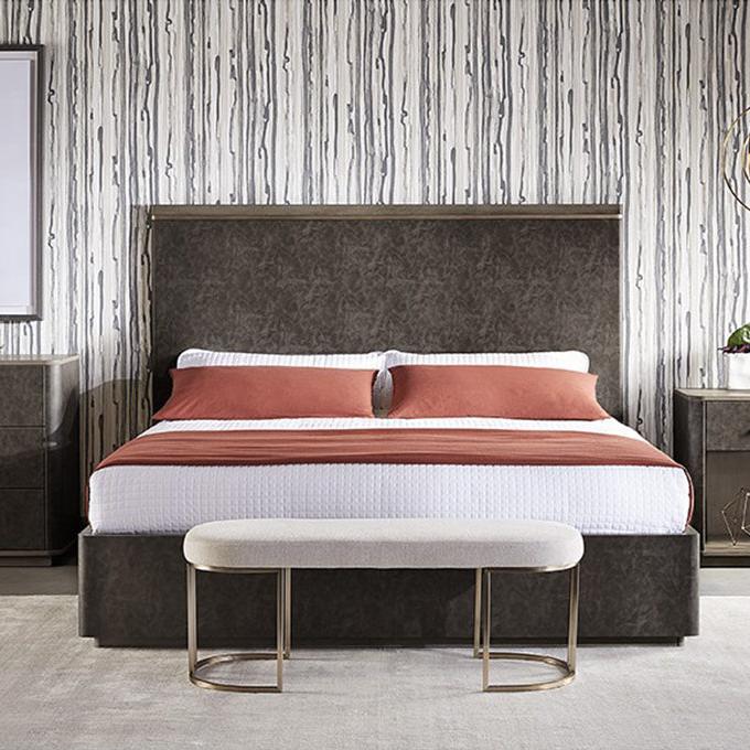 An elegant bench from our Ikon collection. Designed with soft, textured Belfast oatmeal fabric and an exposed antique brass stainless steel frame.