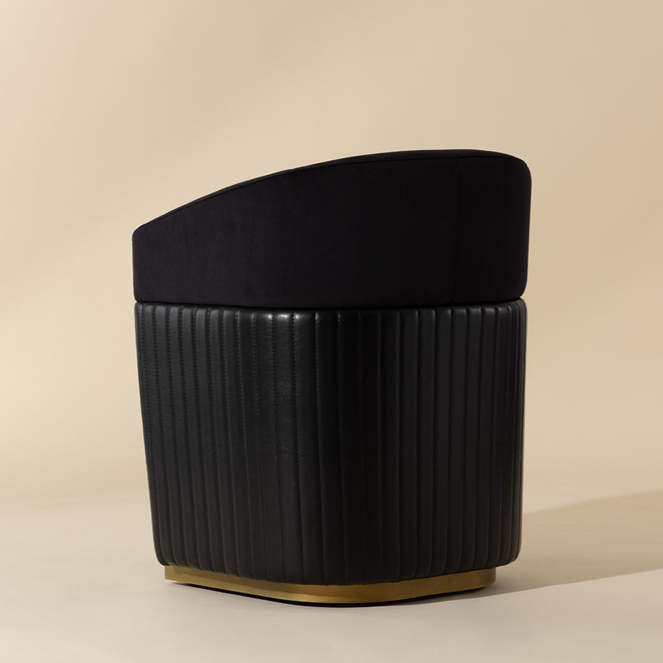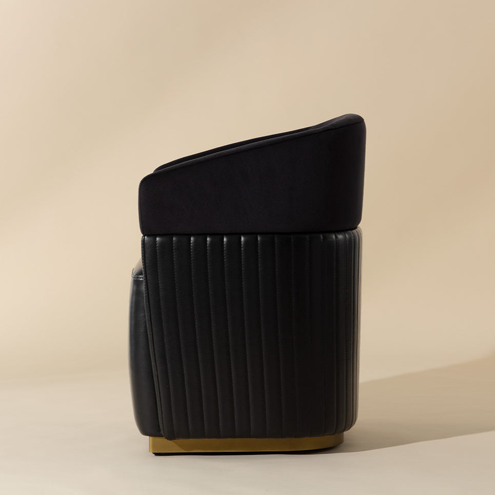 Guests will be intrigued by the unique design details found on this wheeled lounge chair. Designed with contemporary styling, this chair features a channel tufted seatback in abbington black fabric and cantina black bonded leather with a brass frame. Handle with Care: This design has been crafted with bonded leather. Bonded leather is a blend of reconstituted leather and synthetic materials crafted to reflect the natural characteristics of leather; as such, colour variations, markings, wrinkles, grooves and light scratches are acceptable and appreciated characteristics. No two pieces are alike. Visit our Product Care page for more information on how to ensure the lasting beauty of this piece.