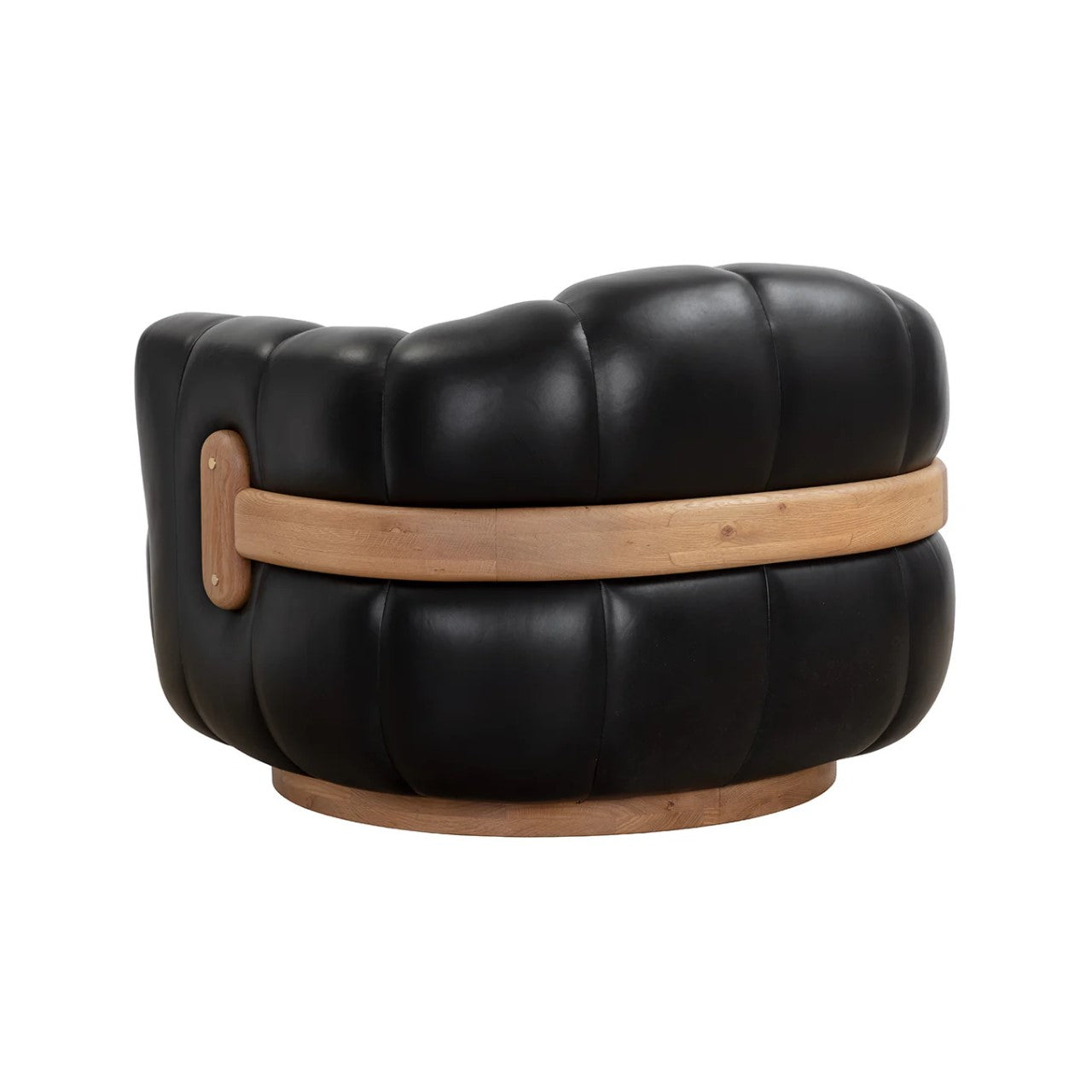 With its shapely silhouette and bolstered seating, the Tadeo Swivel Armchair takes comfort to a different level. A luxurious seat upholstered in our smooth sahara sand top grain leather sits atop an oak wood base. Matching wood detailing along the back of the chair with antique brass accents give a playful yet coordinated look to the design.