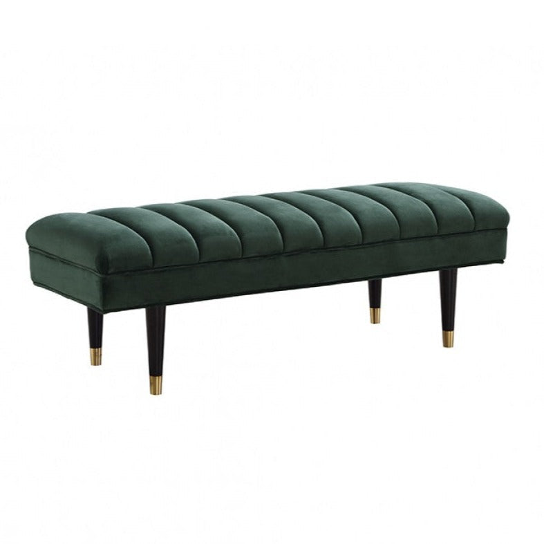 Offering you a comfortable extra sitting is the Divani Casa Ritner Modern Green Velvet Bench. Functional in any room space, this bench in green velvet fabric upholstery exudes freshness and harmony. Accommodating three average-sized persons, it features a thick cushioned seat with ridges. The stitched edges indicate durability so you can enjoy its service to fullness. This modern bench stands on conical black metal legs with gold ring accent.