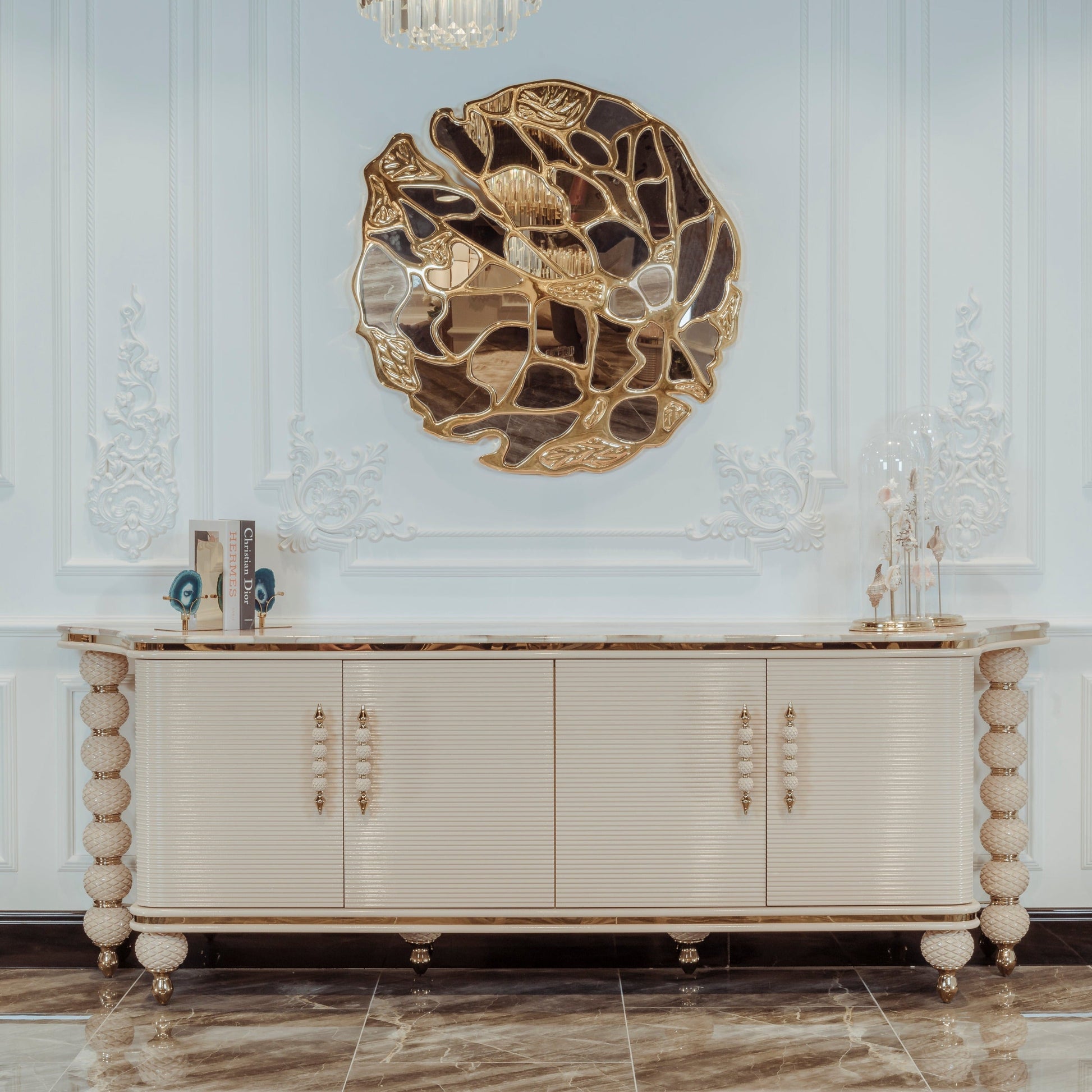 This four-door sideboard embodies intricate classic design, offering a luxurious, traditional look. With a sophisticated marble-finished top, a soft beige finish, and elegant gold accents, this piece is a true work of art that brings timeless elegance to any space.